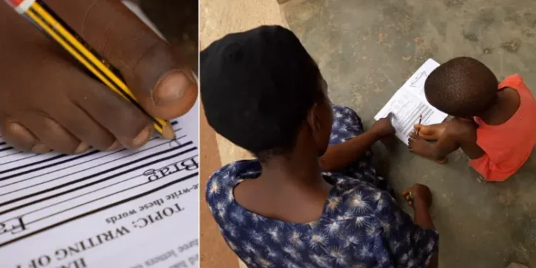Witout hand, little Shindara dey use im leg write and im dream to become a lawyer always dey for im mind.
